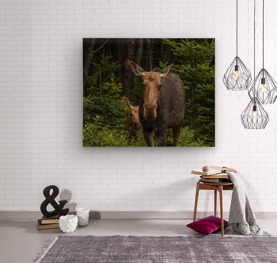 This portrait of a moose and her calf was taken in early summer. The calf was few weeks old. This is a very special portrait that symbolizes the love of a mom. The calf was curious, clingy and excited but was always well protected by momma moose.
