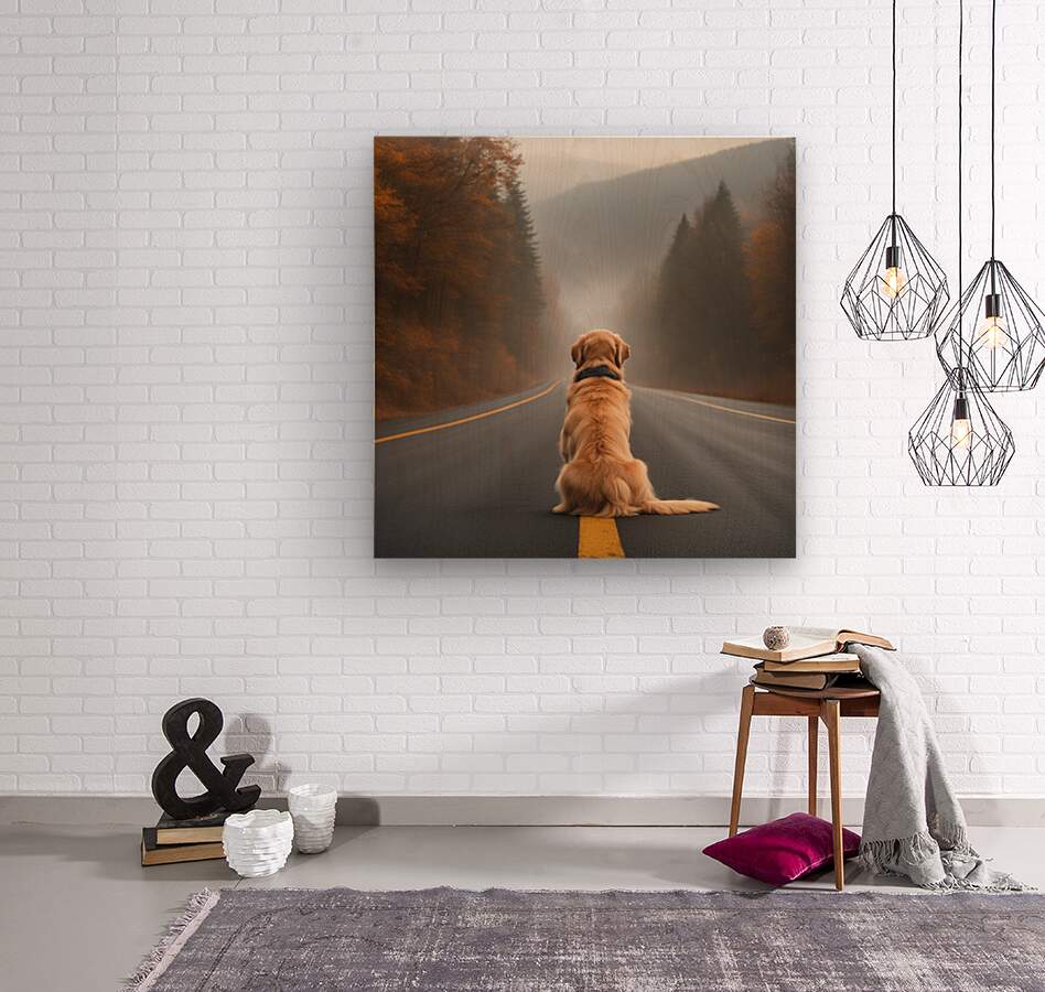 Golden leaves and endless road, my furry friend leads the way into autumn's embrace.