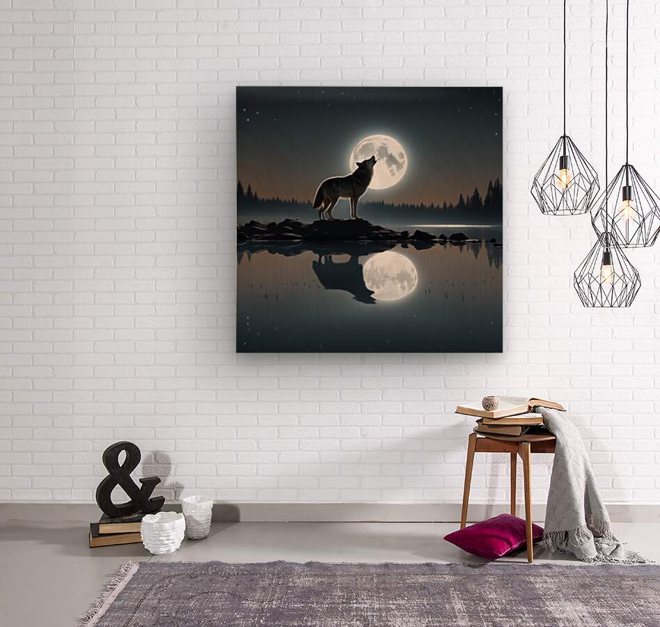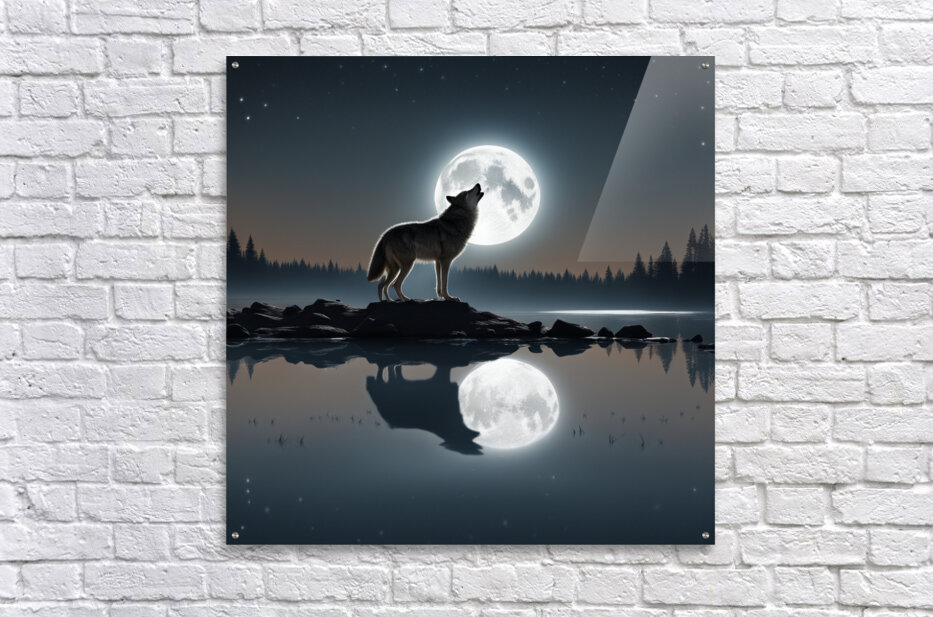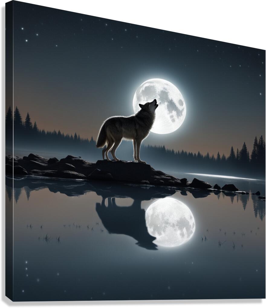 Under the moonlit sky, the wolf's soulful howl echoes, painting a serene reflection by the lake's edge.