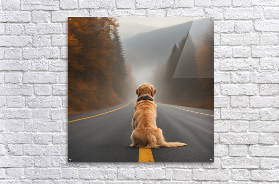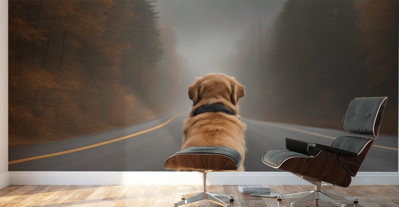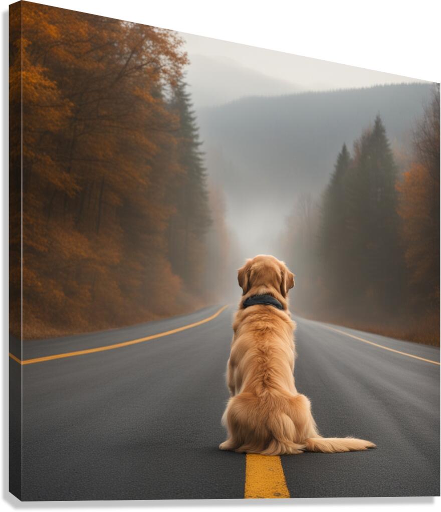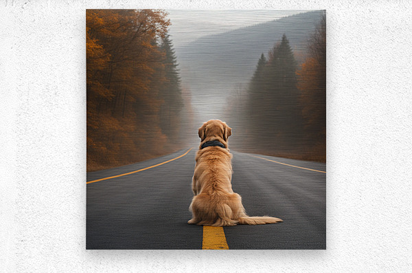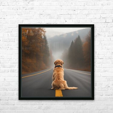 Golden leaves and endless road, my furry friend leads the way into autumn's embrace.