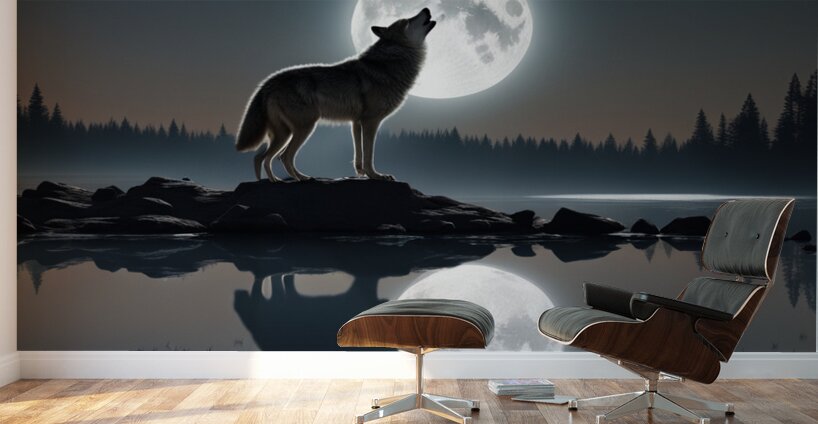 Under the moonlit sky, the wolf's soulful howl echoes, painting a serene reflection by the lake's edge.