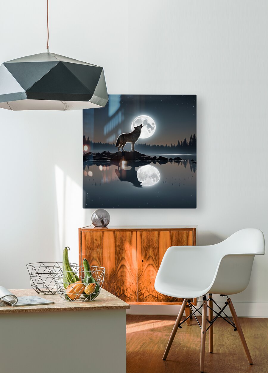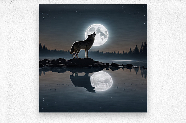 Under the moonlit sky, the wolf's soulful howl echoes, painting a serene reflection by the lake's edge.