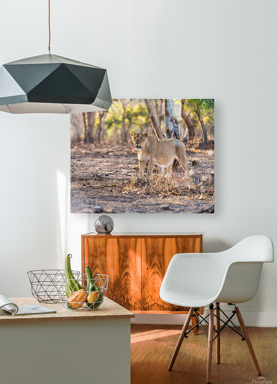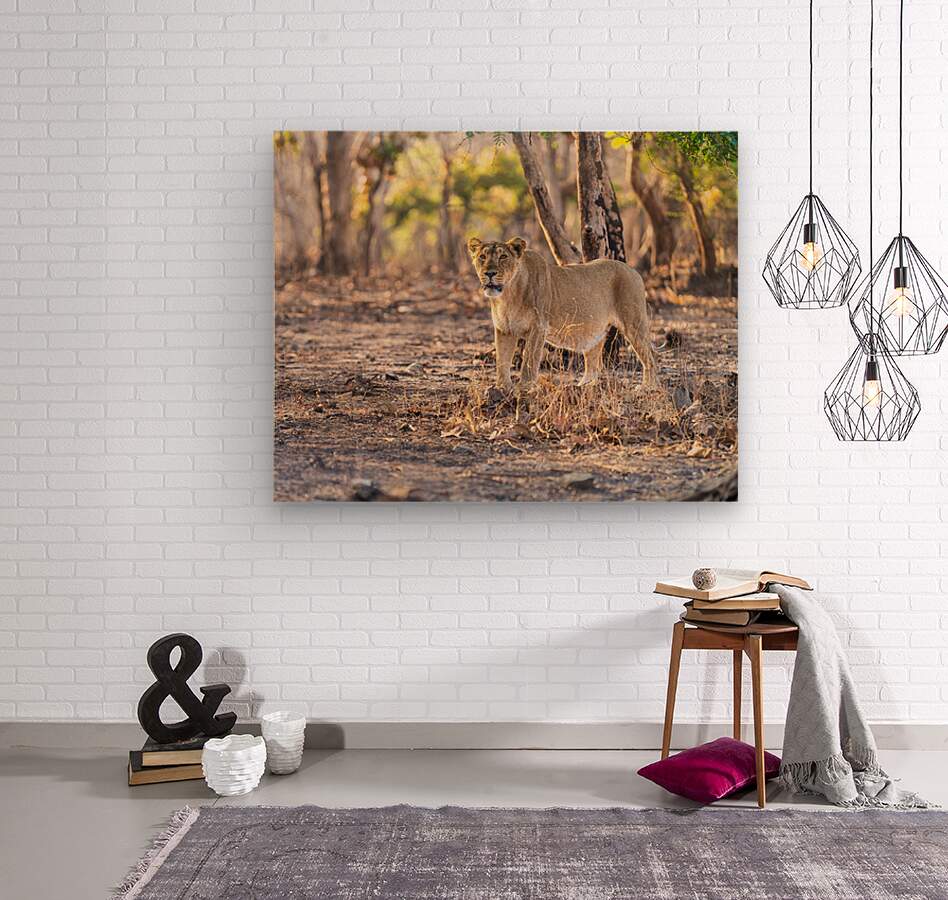 Lioness watching her pride. Wood print